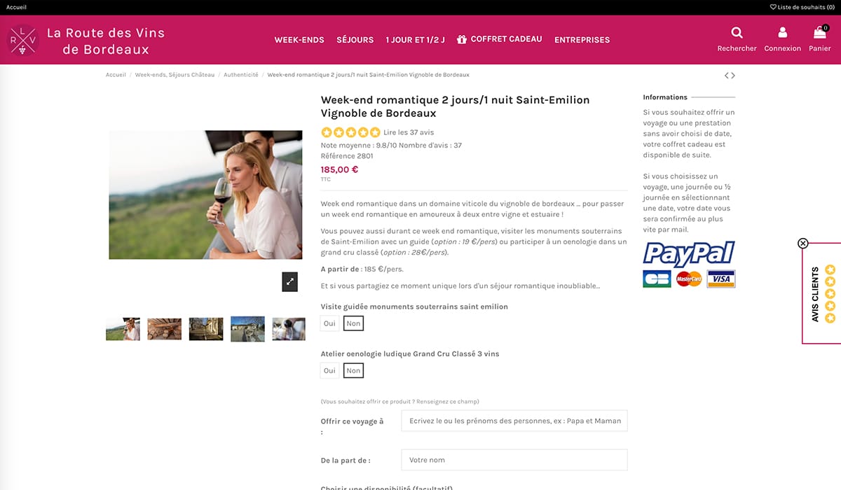 La particularité du site e-commerce est de vendre des séjours touristiques. Pour adapter à Prestashop j'ai du développer des fonctionnalités qui n'existent pas. Choix d'une date, champs personnalisés pour des bons cadeaux, quantité maximale et minimum de chaque produit.